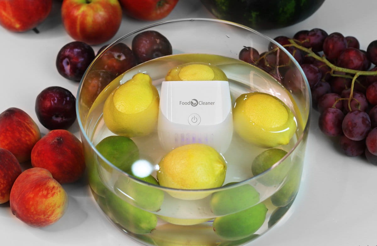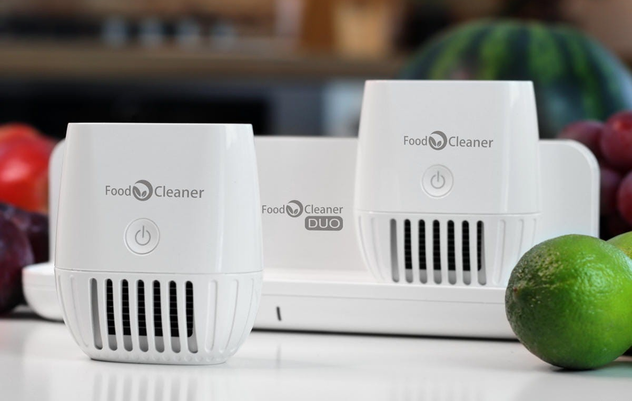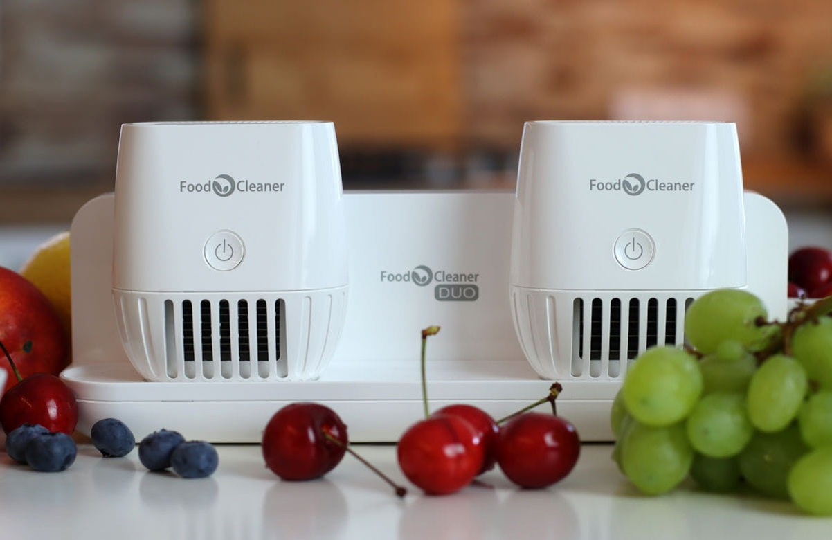 Zweimoduliger Lebensmittelreiniger Food Cleaner DUO. Separate Module zur Reinigung von Obst/Gemüse und Fleisch. Er dient zur Entfernung von Rückständen wie Pestiziden, Antibiotika, Hormonen, Schwermetallen und anderen Verunreinigungen (einschliesslich biologischer). Das Gerät desinfiziert außerdem Küchenutensilien und andere Gegenstände.